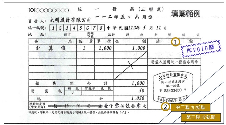 作廢重開;實務上於收執聯及扣抵聯註明「作廢」字樣,並與存根聯一起訂起來,如為電子發票,已列印之電子發票證明聯應收回註明「作廢」字樣,並均應於當期之統一發票明細表註明。